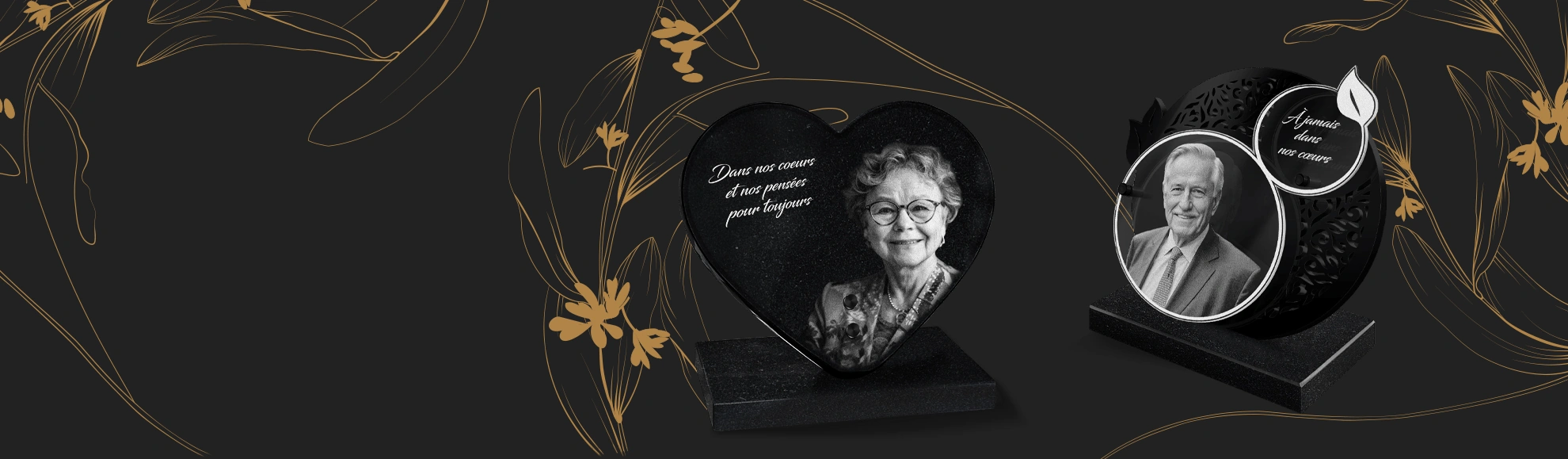 Découvrez notre catalogue de modèles sur différents thèmes prêts à être personnalisés avec la photo et le texte de votre choix. Vous trouverez  également une variété de pictogrammes disponibles, pour pousser la personnalisation un peu plus loin et créer une plaque funéraire unique pour honorer la mémoire de votre être cher.